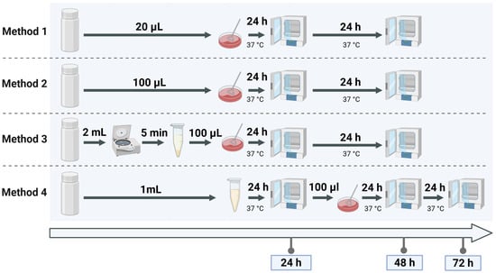 Method 1, used as the reference, reflects the current routine protocol at the Jena University Hospital and involves direct plating of 20 µL of donor milk onto selective media. Method 2 increases the plated volume to 100 µL of donor milk to enhance sensitivity. Method 3 includes a centrifugation step to concentrate bacterial cells from 1 mL of donor milk before plating the pellet. Method 4 incorporates 24 h pre-incubation of 1 mL donor milk in buffered peptone water, based on a standardised method originally developed for the detection of Enterobacteriaceae in food matrices [23], adapted here for use in human milk screening. The experimental setup for these methods is depicted in Figure 2, which illustrates the step-by-step procedure.