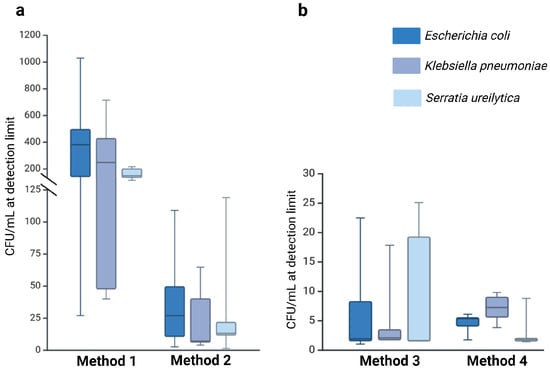 Detection limits (LOD) for E. coli, K. pneumoniae, and S. ureilytica across the four methods, illustrating the effects of sample volume and enrichment on pathogen recovery. Method 1 used a small sample volume, while Methods 2, 3, and 4 used a larger sample volume (100 μL). Methods 1 and 2 were performed without enrichment (a), whereas Methods 3 and 4 included an enrichment step (b). The coloured box represents the interquartile range (IQR), the horizontal line within the box indicates the median, and the whiskers extend to 1.5 × IQR, illustrating the data distribution.