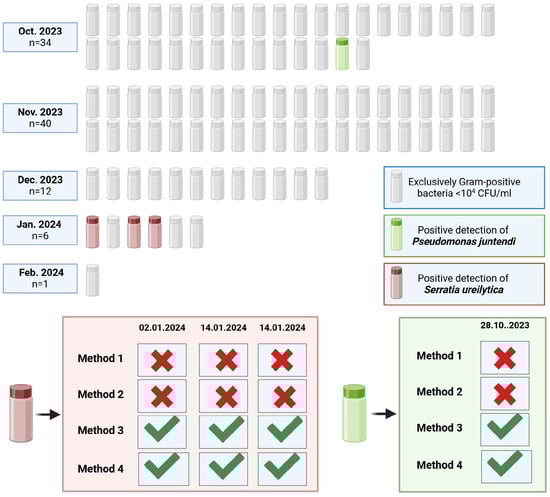 To evaluate the performance of four detection methods under conditions simulating routine diagnostic use, 93 raw donor milk samples were collected from a single donor between late October 2023 and February 2024. In September and early October 2023, Serratia species had been detected in several donor milk samples from this individual during routine microbiological screening. Due to a suspected epidemiological link between these milk samples and Serratia detections in neonatal patients (unpublished data), the donor was excluded from further milk provision. The corresponding bacterial isolates from September and early October were not available for this study. However, subsequently donated milk samples from late October onwards remained stored frozen and were made available for extended microbiological analysis to clarify the suspected transmission event from a hospital hygiene perspective. This unique clinical context enabled us to assess multiple raw milk samples from the same donor under controlled laboratory conditions. Due to constraints related to clinical supply and usage, no additional milk samples from other donors could be obtained for research purposes. While the use of samples from a single donor limits the generalisability of our findings, it allowed for a detailed longitudinal assessment of microbial presence and method performance over time. The milk was collected in a clinical setting and immediately frozen at −20 °C. Prior to microbiological analysis, all samples were completely thawed at room temperature. Columbia blood agar (BD, Heidelberg, Germany) was utilised for the detection of Gram-positive pathogens, while MacConkey agar (BD, Heidelberg, Germany) was used for the detection of Gram-negative pathogens. The results were recorded after 24 and 48 h of incubation at a temperature of 37 °C. For all Gram-negative detections, short-read sequencing was performed to confirm species identification.