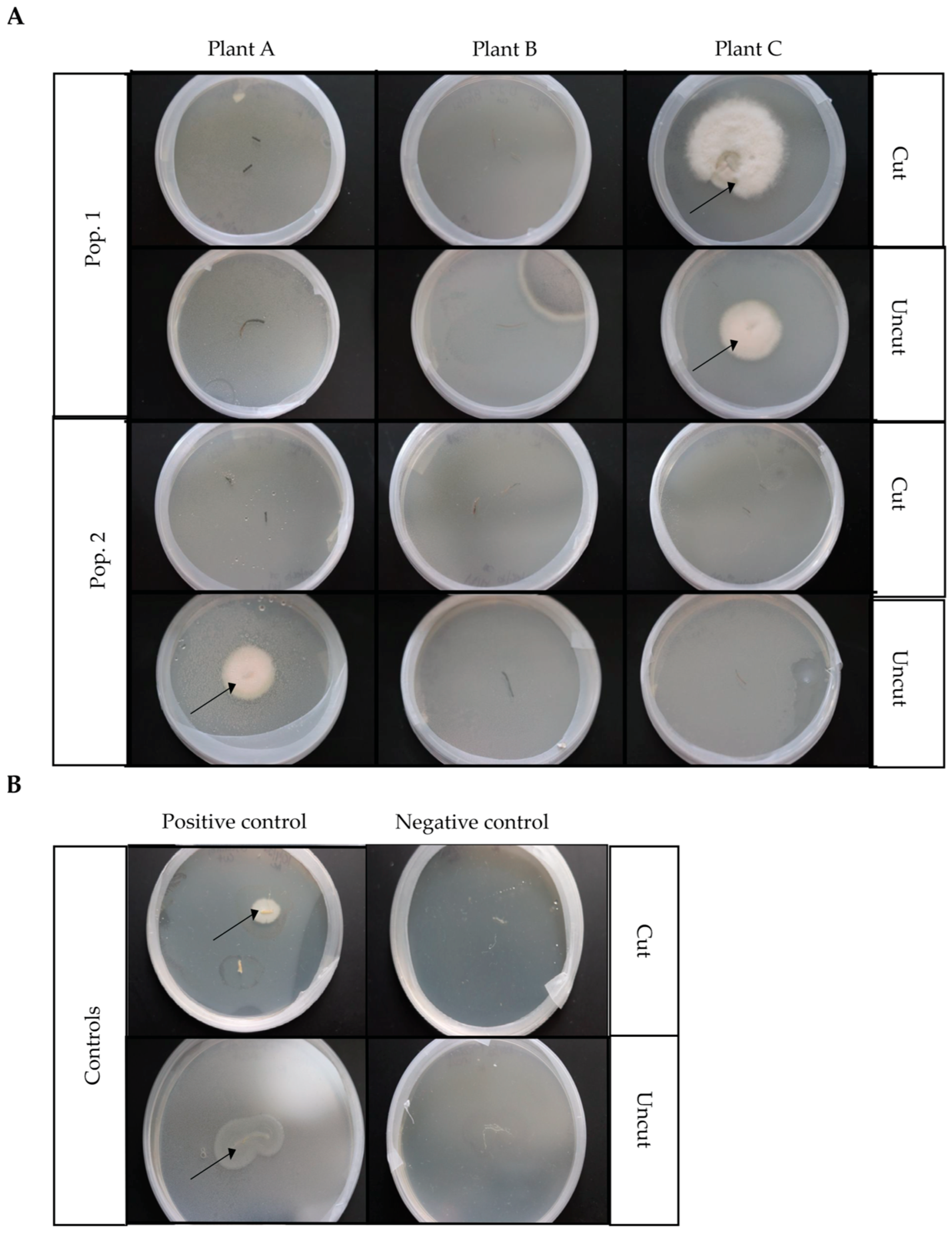 Pop. 1 Plant C cut root | III | Solid, white, fuzzy, uneven circular formation, raised |