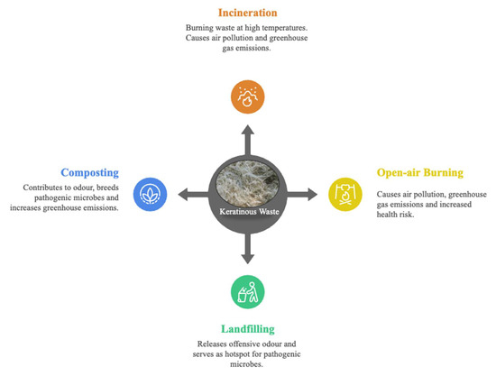 The need to process chicken, fish, birds, and reptiles for food is pertinent for sustaining the burgeoning global population. However, the waste materials associated with these products are typically disposed of with little or no recycling, thus posing adverse effects on human health and the environment. Methods of disposing of keratinous wastes include incineration, composting, open-air burning, and landfilling, causing ecological perturbation and increasing the carbon footprint [32]. The landfilling of this stubborn biomass is associated with foul smell, flies and rodents’ infestation, water and soil pollution [3]. The leather industry significantly contributes to air, water, and soil pollution, producing large amounts of solid and liquid keratin wastes of animal origin [33]. Additionally, keratinous wastes are hotspots for pathogenic bacteria, especially chicken feathers, while human hair contributes to clogging the drainage systems [34,35,36,37].