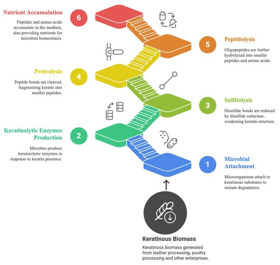 Keratinolytic microflora completely degrade keratinous biomass in four sequential steps: adhesion, colonization, production of keratinolytic enzymes, and breakdown of the keratin substrate, as illustrated in Figure 2 [2,42]. The first step, adhesion, occurs when keratinolytic microflora bind to the keratin. The microbial organisms then colonize the surface of the keratinous biomass and begin expressing the relevant ancillary enzymes for degrading biomass components other than keratin. The removal of these components exposes the keratin macromolecular structure to enzymatic attacks [43]. The secreted keratinolytic enzyme cocktails then reduce the closely packed disulfide bonds in the keratin polymer. This disulfide bond reduction encourages subsequent digestion by exo- and endo-oligopeptidases, generating free amino acids and short peptides.
