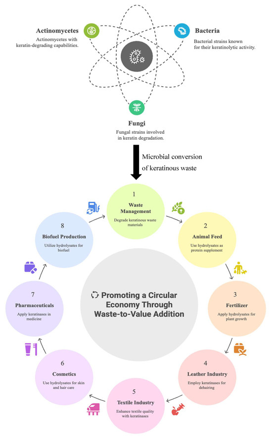 Keratinous wastes, generated from various industries such as poultry processing, slaughterhouses, and salons, accumulate in the environment due to their slow degradation caused by high disulfide cysteine bonds. Traditional methods of managing these wastes, including incineration, composting, open-air burning, and landfilling, have several disadvantages, such as environmental pollution, release of toxic compounds, and breeding of pathogenic and multidrug-resistant microorganisms. Microbial keratinases, produced by bacteria, fungi, and actinomycetes, offer an eco-friendly alternative for valorizing keratinous waste into valuable peptides and amino acids. The biodegradation of keratinous biomass involves four sequential steps: adhesion, colonization, production of keratinolytic enzymes, and breakdown of the keratin substrate. Optimization of culture conditions, such as pH, temperature, substrate concentration, and metal ions, can enhance keratinase production for industrial applications. Keratinases have multifaceted applications in various sectors, including cosmetics, organic fertilizers, leather treatment, animal feed, detergents, and pharmaceuticals. This review highlights the need to explore keratinolytic strains further and improve keratinase yields to develop sustainable solutions for keratinous waste management and generate value-added products, promoting a circular economy. The techno-economic considerations and current limitations in industrial-scale keratinase production are also discussed, emphasizing the importance of future research in this field.