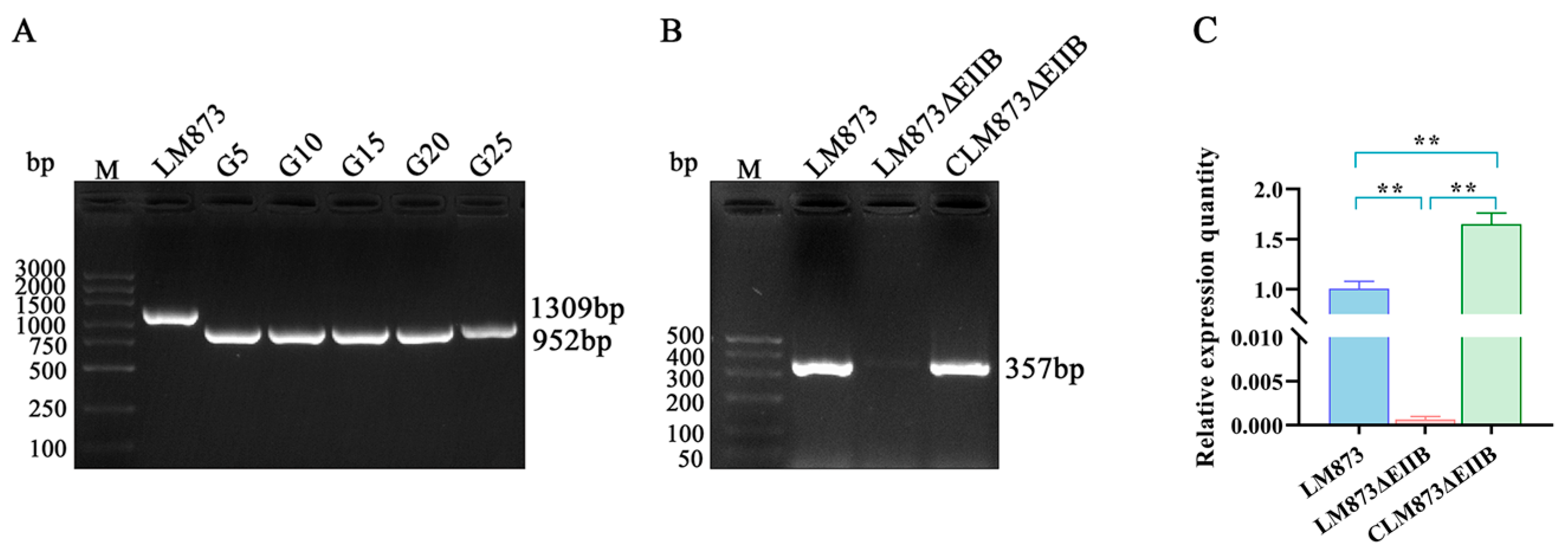 3.1. Construction of LM873EIIB Deletion Strain and Complement Strain