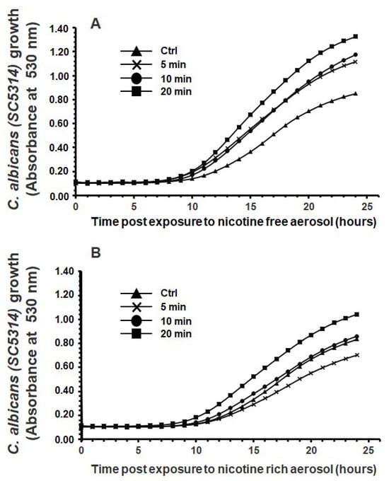 Exposure to e-cigarette aerosol (A) without or (B) with 12 mg/mL nicotine promoted the growth of Candida albicans. The cells were exposed twice a day to e-cigarette aerosol, and growth was evaluated by measuring turbidity at 530 nm using a spectrophotometer (n = 5).