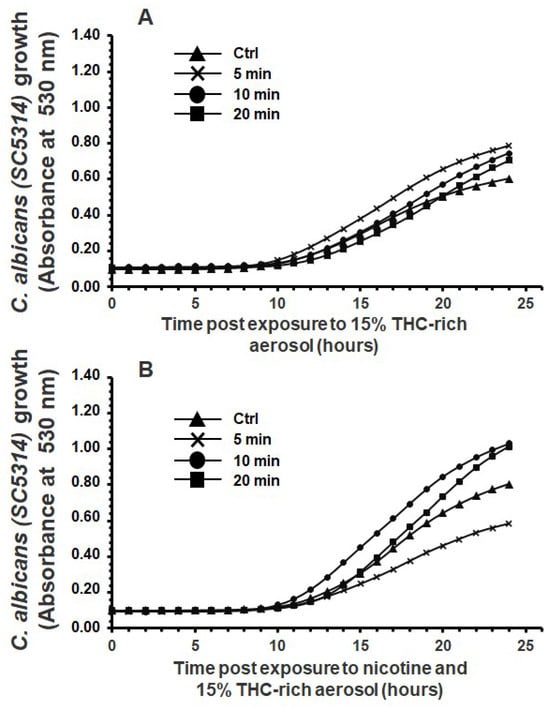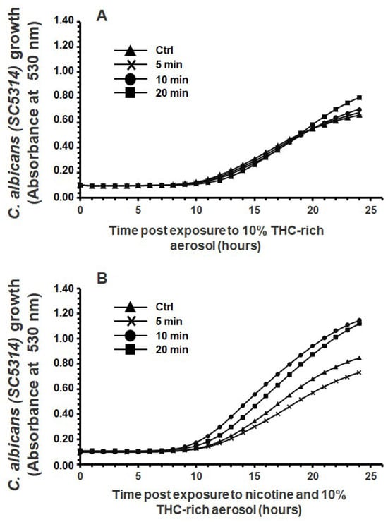Exposure to e-cigarette aerosol with 15% tetrahydrocannabinol (THC) and (A) without or (B) with 12 mg/mL nicotine promoted the growth of Candida albicans. The cells were exposed twice a day to e-cigarette aerosol, and growth was evaluated by measuring turbidity at 530 nm using a spectrophotometer (n = 5).