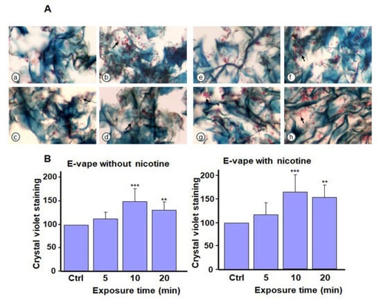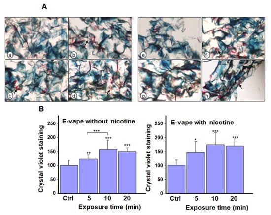 Biofilm formation by Candida albicans after exposure to e-cigarette aerosol with or without nicotine. The cells were exposed to e-cigarette aerosol twice a day for 3 days and then subjected to (A) Masson’s trichrome and (B) crystal violet staining. For each panel, (a,e) show the control (no exposure), (b,f) show exposure for 5 min, (c,g) show exposure for 10 min, and (d,h) show exposure for 20 min. Note that (b–d) refer to e-cigarette aerosol without nicotine, and (f–h) refer to e-cigarette aerosol with nicotine. The arrows showed C. albicans cell accumulation in the biofilms. * p < 0.05 and *** p < 0.001 when comparing exposure to e-cigarette aerosol to no exposure (n = 4).