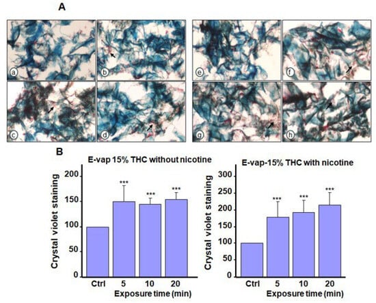 Biofilm formation by Candida albicans after exposure to e-cigarette aerosol with 15% tetrahydrocannabinol (THC) and with or without nicotine. The cells were exposed to e-cigarette aerosol twice a day for 3 days and then subjected to (A) Masson’s trichrome and (B) crystal violet staining. For each panel, (a,e) show the control (no exposure), (b,f) show exposure for 5 min, (c,g) show exposure for 10 min, and (d,h) show exposure for 20 min. Note that (b–d) refer to e-cigarette aerosol with 15% THC but without nicotine, and (f–h) refer to e-cigarette aerosol with 15% THC and nicotine. The arrows showed C. albicans cell accumulation in the biofilms. *** p < 0.001 when comparing exposure to e-cigarette aerosol to no exposure (n = 4).