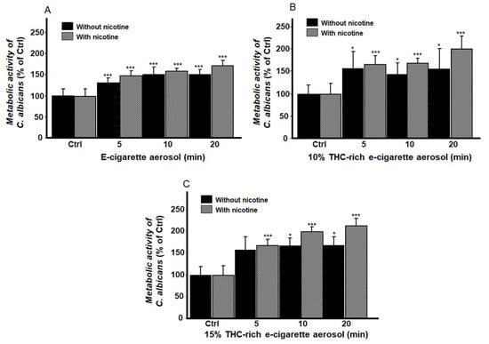 Exposure to e-cigarette aerosol increased the metabolic activity of Candida albicans based on the 3-(4,5-dimethylthiazol-2-yl)-2,5-diphenyltetrazolium bromide (MTT) assay. The cells were exposed to e-cigarette aerosol (A) with or without nicotine, (B) with 10% tetrahydrocannabinol (THC) and with or without nicotine, or (C) with 15% THC and with or without nicotine twice a day. * p < 0.05, *** p < 0.001 when comparing exposure to e-cigarette aerosol to no exposure (n = 5).