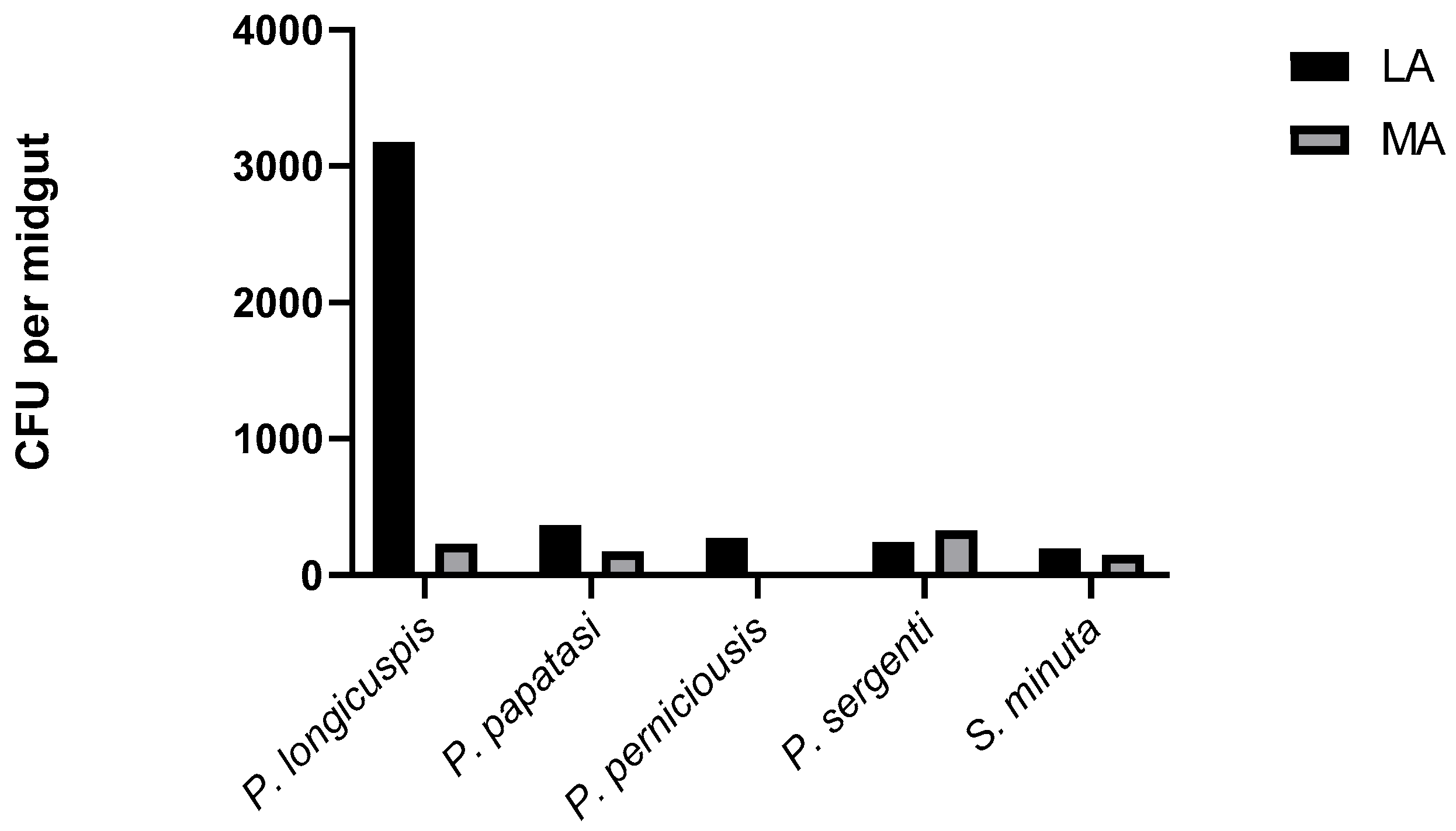 - Fraihi, W.; Fares, W.; Perrin, P.; Dorkeld, F.; Sereno, D.; Barhoumi, W.; Sbissi, I.; Cherni, S.; Chelbi, I.; Durvasula, R.; et al. An integrated overview of the midgut bacterial flora composition of Phlebotomus perniciosus, a vector of zoonotic visceral leishmaniasis in the Western Mediterranean Basin. PLoS Negl. Trop. Dis. 2017, 11, e0005484. [Google Scholar] [CrossRef]