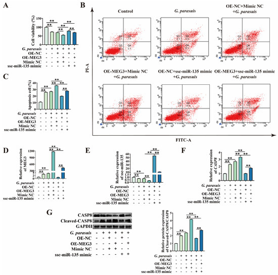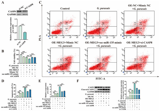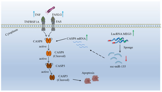 3.5. MEG3 Regulates G. parasuis-Induced Apoptosis in 3D4/21 Cells via ssc-miR-135/CASP8 Axis