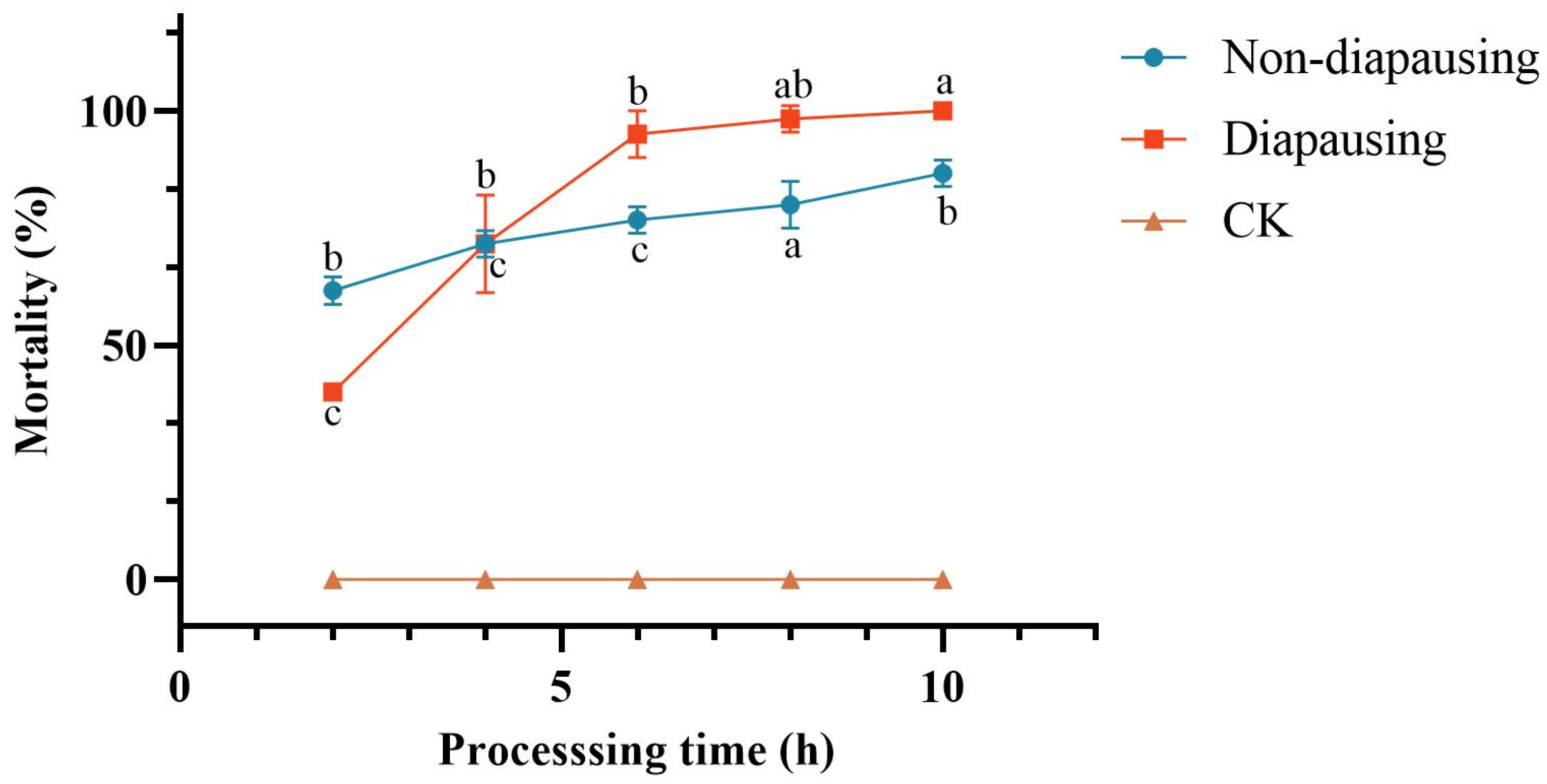 C. chuxiongica larvae. The toxicity of the substance was more potent against non-diapause larvae within four hours of treatment than it was against diapause larvae. However, the toxicity of the substance against diapause larvae became more potent after four hours of treatment. The physiological status of the larvae (metabolic activity, barrier function, detoxification ability) and the mechanism of action of the toxin are the primary factors contributing to the time-dependent difference in toxicity. The toxin’s absorption and action are expedited by the high metabolic activity of non-diapause larvae in the early stage, whereas the low metabolic state of diapause larvae results in long-term accumulation and slow toxin clearance, ultimately leading to stronger toxicity in the later stage [