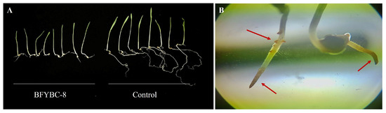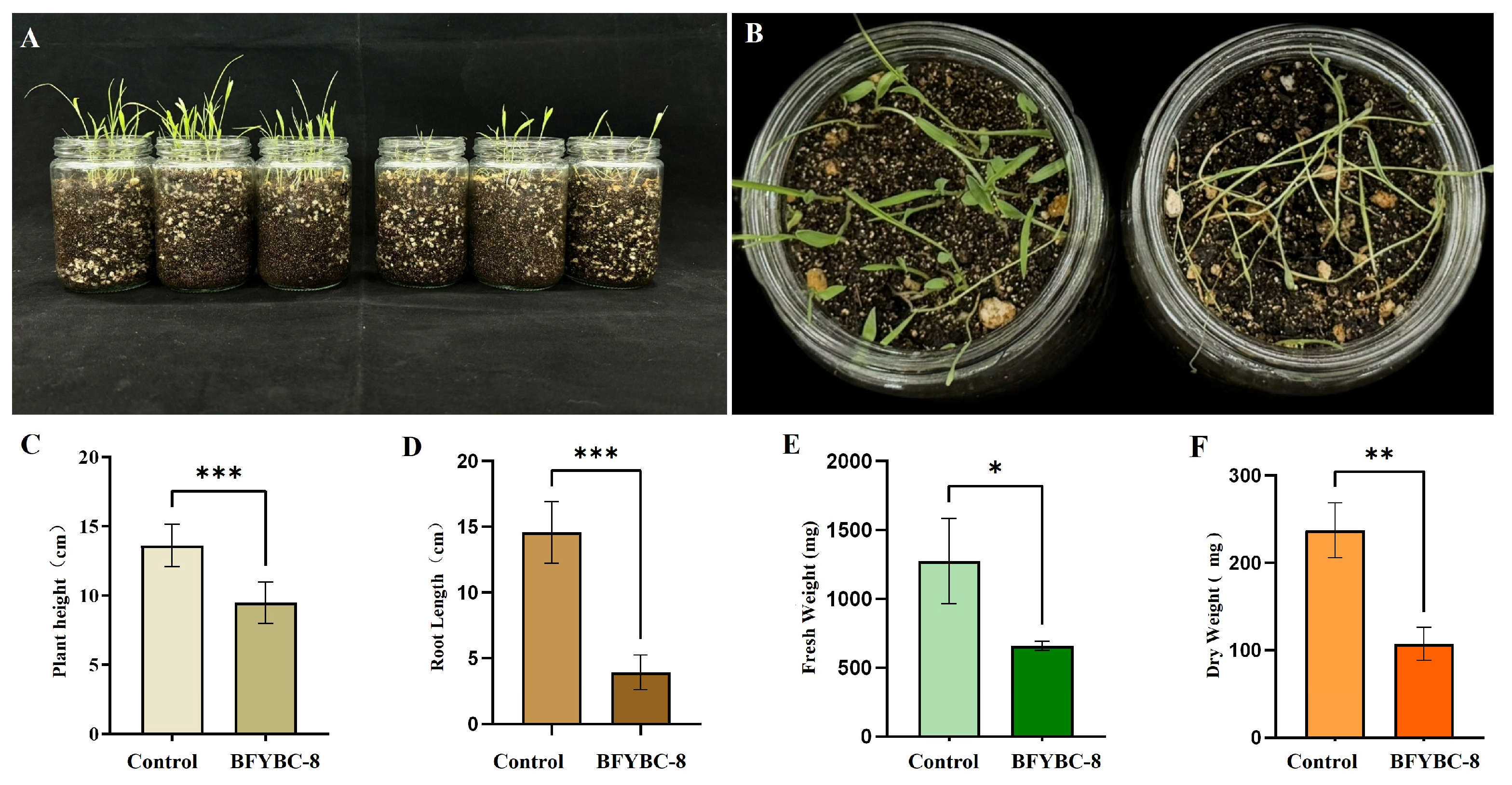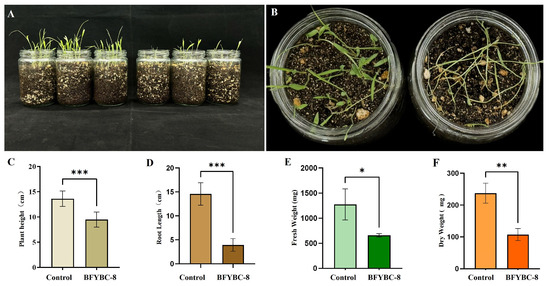 APA StyleYang, D., He, Q., Wang, Q., Zhou, J., Ke, H., Wen, X., Pan, J., Zhou, Y., & Jiang, J. (2025). Herbicidal Control Potential of the Endophytic Bacterium B. pseudorignonensis BFYBC-8 Isolated from E. crus-galli Seeds. Microorganisms, 13(10), 2293. https://doi.org/10.3390/microorganisms13102293