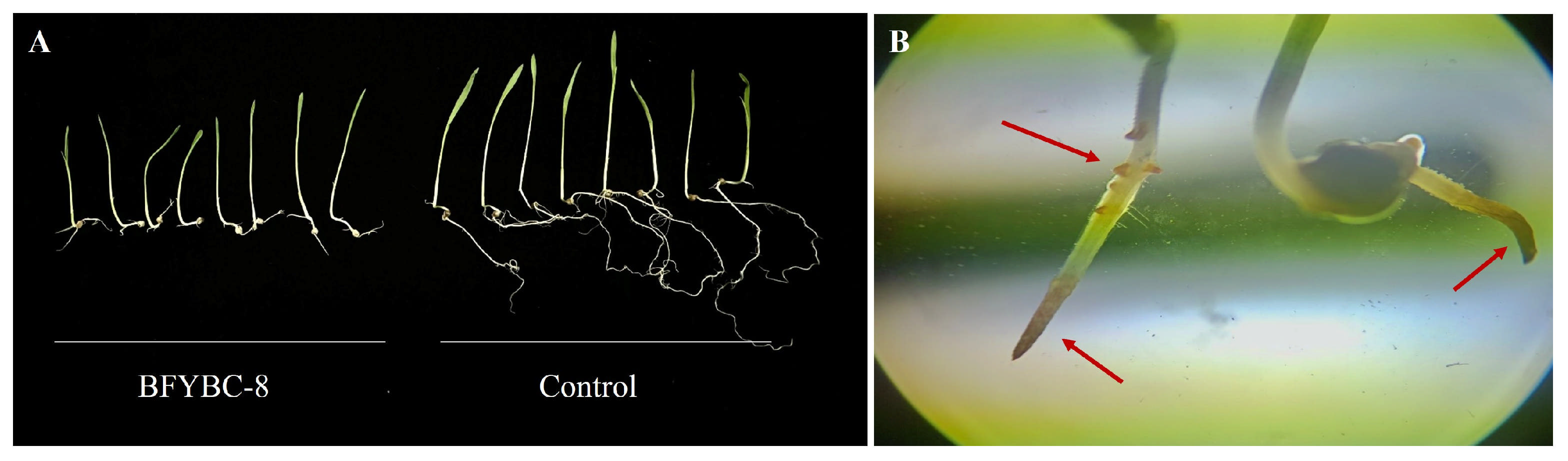 3.3. Pot Experiment of Pathogenic Strains B. pseudorignonensis BFYBC-8