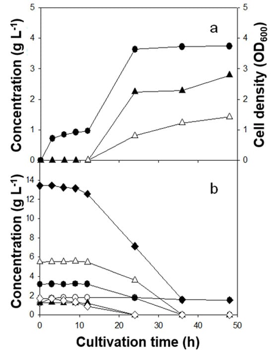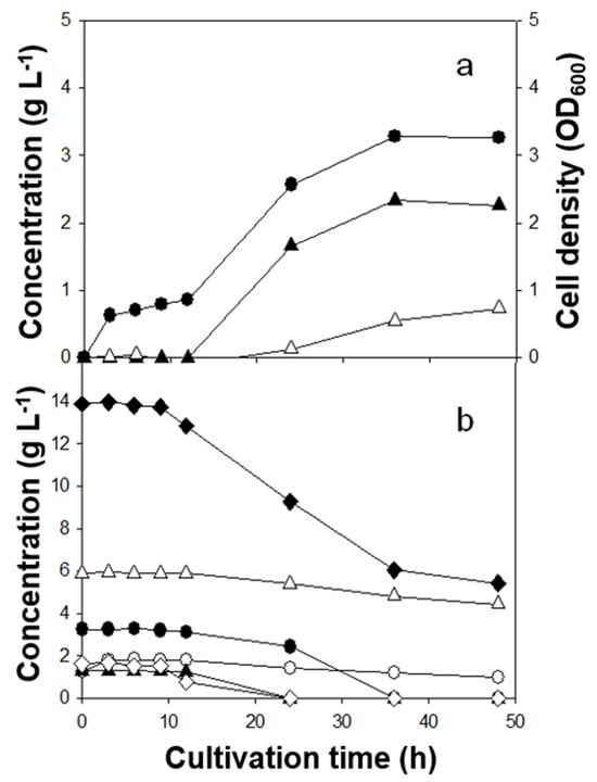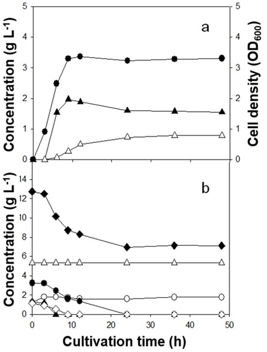 Lactic acid fermentation of C. fulvescens hydrolysate by L. rhamnosus. (a) Cell growth and product formation. ●, Cell density (OD600); ▲, lactic acid; △, acetic acid. (b) Sugar consumption profile. ◆, total sugar consumption; △, D- xylose; ●, L-rhamnose; ▲, D-glucose; ◇, D-mannose; ○, D-glucuronic acid.
