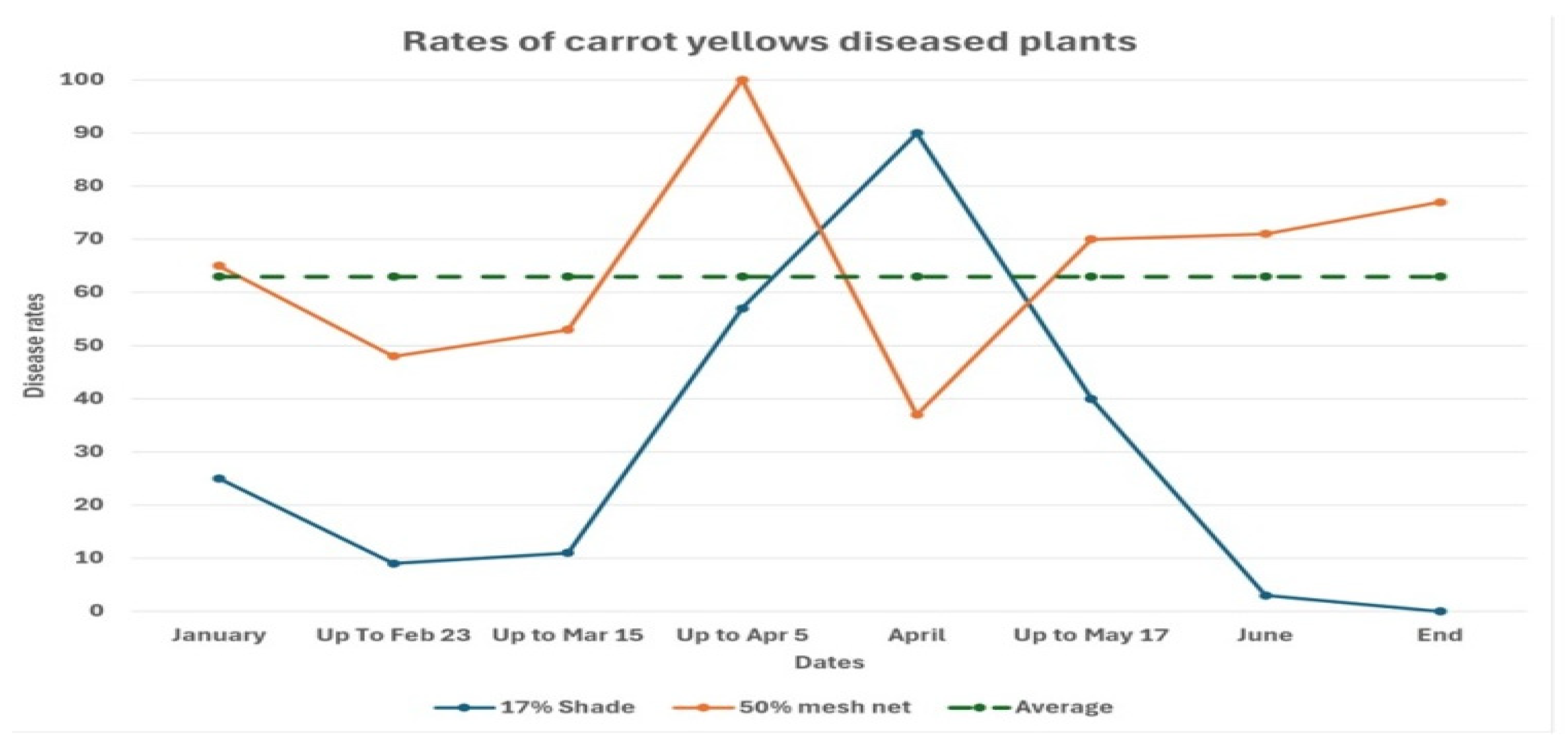 - Bar-Joseph, M.; Gera, A. Netting and insecticide spraying effects on Carrot Yellow Disease incidence Section 5. In Management of the Carrot Yellow Disease Report in Ministry of Agriculture Israel; Gera, A., Mawassi, M., Dar, Z., Steinberg, D., Ghanim, M., Dekko, Z., Eds.; Chief Scientist, Research Management System 132-1603-12; Ministry of Agriculture Israel: Beit Dagan, Israel, 2015; pp. 19–21. (In Hebrew) [Google Scholar]