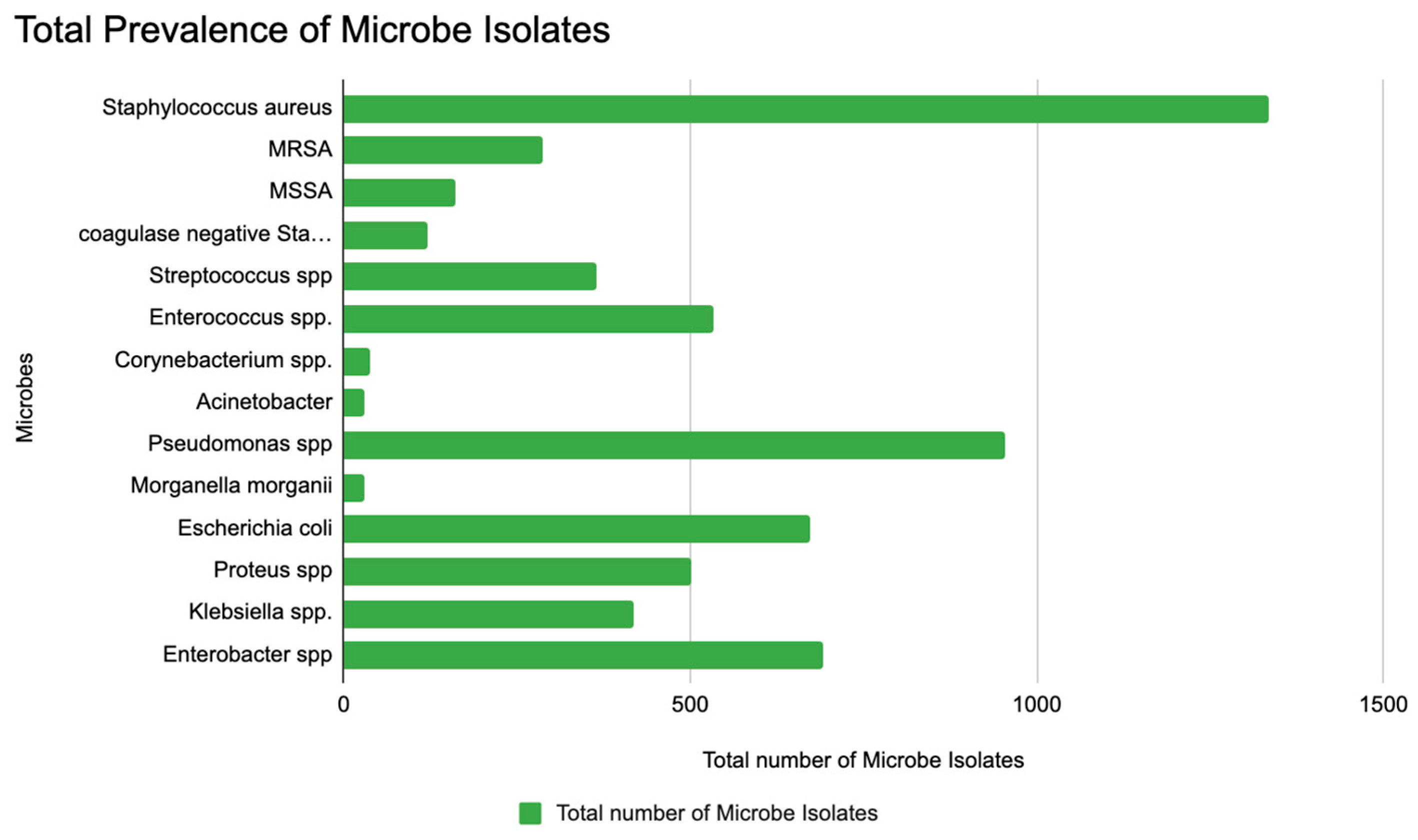 - Microbiological data: prevalence and type of bacterial isolates, including Staphylococcus aureus (MRSA and MSSA), Pseudomonas spp., Proteus spp., Escherichia coli, Enterobacter spp., and others.