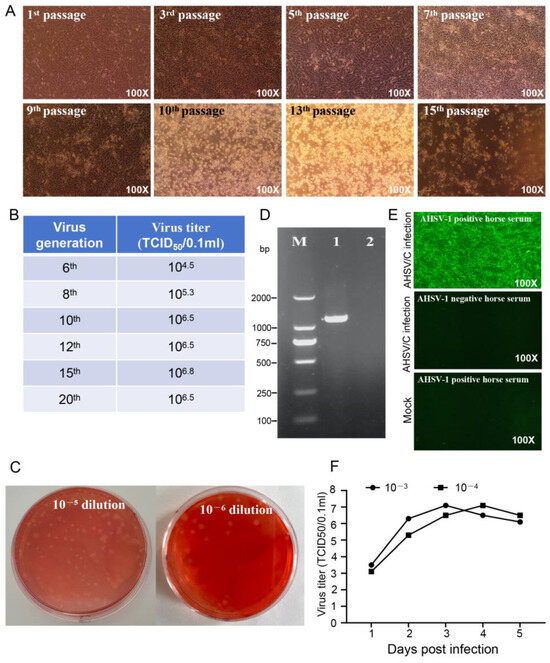Adaptability and identification of AHSV/C in Vero cells: (A). CPE induced by indicated passages of AHSV/M during serial propagation in Vero cells, with 1st passage to 15th passage representing the number of passages of AHSV/M in Vero cells; (B). Virus titer of different passages of AHSV/M during serial propagation in Vero cells (The experiment was repeated two times, and the results of the two trials were similar); (C). After 12 generations of passage, AHSV/M formed primary plaques in Vero cells (The left panel shows a 10−5 dilution, and the right panel shows a 10−6 dilution); (D). RT-PCR identification of AHSV/C based on VP7 genomic fragment (M: DL2000 marker; 1: mRNA extracted from Vero cells infected with AHSV/C; and 2: mRNA extracted from the uninfected Vero cells as a negative control); (E). Identification of AHSV/C using IFA with an AHSV-1-positive/negative horse serum (The experiment was repeated two times, and the results of the two trials were similar); Mock: uninfected Vero cells; (F). The growth curve of AHSV/C, with 10−3 and 10−4 indicating the dilutions of seeded AHSV/C, respectively (The experiment was repeated two times, and the results of the two trials were similar).
