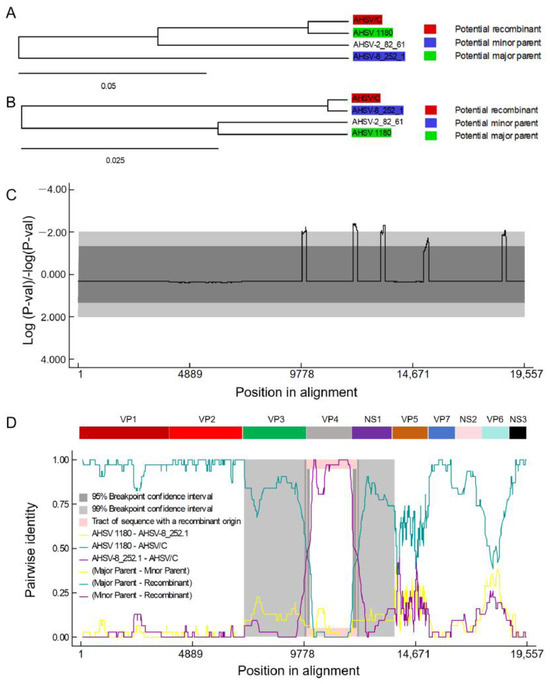 Identification of AHSV/C genome reassortment events. (A) Unweighted Pair-Group Method with Arithmetic mean (UPGMA) phylogenetic tree of nucleotides 1–9909 and 12,137–19,557 of concatenated whole-virus genome, (B) UPGMA phylogenetic tree of nucleotides 9910–12,136 of concatenated whole-virus genome, (C) Breakpoint distribution and (D) Reassortment detection on the basis of pairwise distance identity.