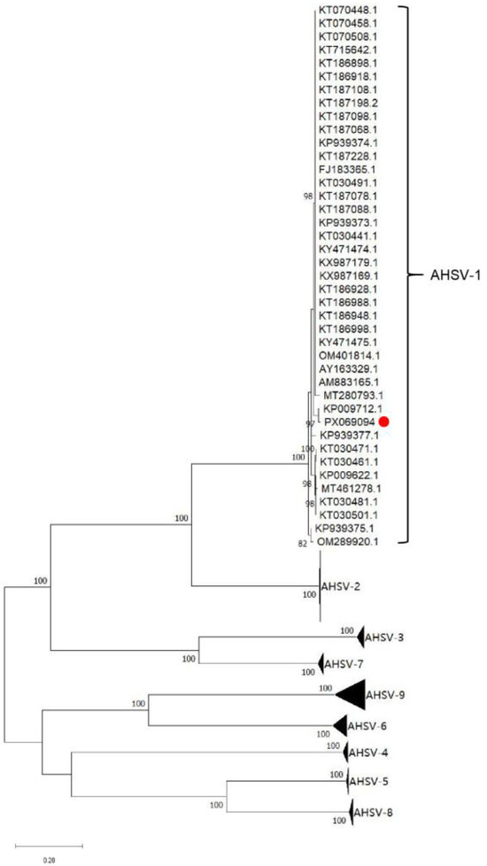 The following supporting information can be downloaded at: https://www.mdpi.com/article/10.3390/microorganisms13102314/s1, Figure S1: Comparison of the deduced amino acid sequences of AHSV-1 VP2; Table S1: Blast N search results for vp1 segment of the AHSV/C: Table S2: Blast N search results for vp2 segment of the AHSV/C; Table S3: Blast N search results for vp3 segment of the AHSV/C; Table S4: Blast N search results for vp6 segment of the AHSV/C; Table S5: Blast N search results for vp7 segment of the AHSV/C; Table S6: Blast N search results for ns1 segment of the AHSV/C; Table S7: Blast N search results for ns2 segment of the AHSV/C; Table S8: Blast N search results for ns3 segment of the AHSV/C; Table S9: Blast N search results for vp4 segment of the AHSV/C; Table S10: Blast N search results for vp5 segment of the AHSV/C.