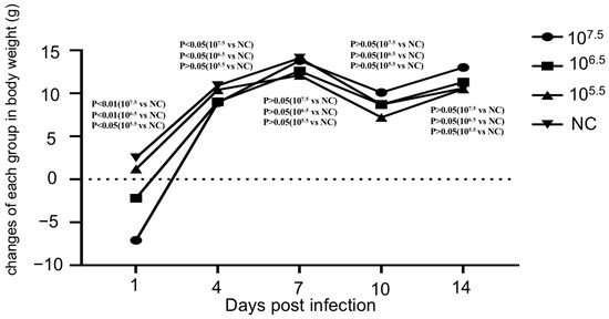 Weight gain: We defined the day before virus infection as Day 0 (0 dpi, where dpi refers to days post-infection), and the body weight of each mouse measured on this day was set as the “baseline body weight”. For each subsequent time point (1 dpi, 4 dpi, 7 dpi, 10 dpi, 14 dpi), the changes in body weight of each mouse was calculated using the formula: Changes in body weight of each mouse (g) = Body weight at the target dpi (g)—Baseline body weight (0 dpi, g). Independent samples t-test was applied to compare the body weight changes between the inoculated group and the control group (statistical significance was calculated using SPSS software 26.0, n = 10).