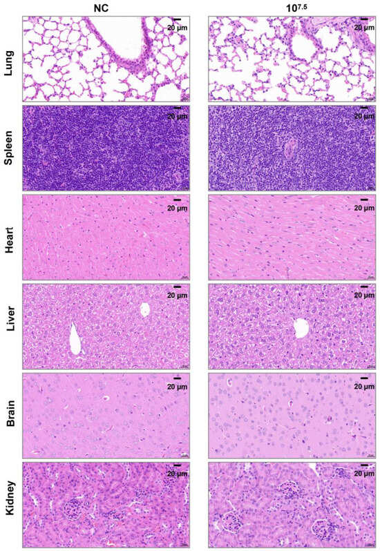 Autopsies were conducted on mice from both the infected and control groups, and no obvious gross pathological lesions were observed. Furthermore, no pathological lesions were observed in any of the infected mice during histopathological examinations (Representative images are shown in Figure 5 for the high-dose group, 107.5 TCID50/mL. The images of the medium-dose group and the low-dose group are shown in the supplementary original images file).
