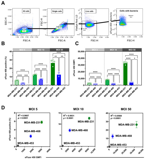 We assessed the internalization of eFluor 450-labeled P. aeruginosa in viable MDA-MB-468, MDA-MB-231, and MDA-MB-453 cells using spectral flow cytometry with a gentamicin protection assay (Figure 1A). Infections at multiplicities of infection (MOIs) of 5, 10, and 50 revealed clear, dose-dependent, cell line-specific differences in both the proportion of positive cells (Figure 1B) and bacterial load, expressed as geometric mean fluorescence intensity (GMFI; Figure 1C). One-way ANOVA confirmed significant effects of MOI on the percentage of positive cells in MDA-MB-231 (F(2,6) = 67.03, p < 0.0001) and MDA-MB-468 (F(2,6) = 36.35, p = 0.0004), both showing strong linear trends across increasing MOIs (p < 0.01). By contrast, MDA-MB-453 displayed no significant MOI-dependent changes (F(2,6) = 1.10, p = 0.39), consistent with its minimal uptake. Analysis of GMFI revealed parallel results, with highly significant MOI effects in MDA-MB-231 (F(2,6) = 427.7, p < 0.0001) and MDA-MB-468 (F(2,6) = 297.6, p < 0.0001), confirming robust dose-dependent increases in bacterial load, whereas MDA-MB-453 exhibited negligible changes. Internalization correlated strongly with bacterial load across MOIs in MDA-MB-231 and MDA-MB-468 (R2 = 0.96–0.99, p < 0.0001), whereas MDA-MB-453 showed no meaningful correlation (Figure 1D).