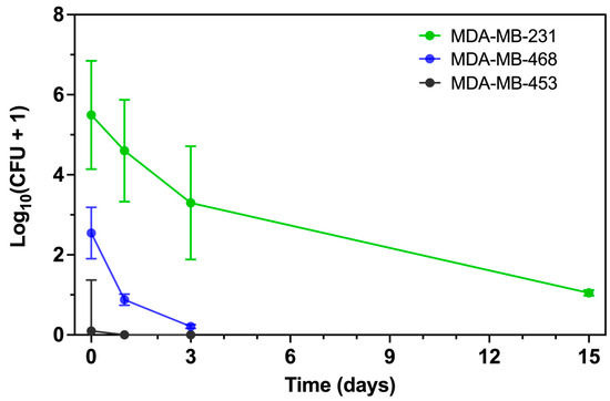 Importantly, viable P. aeruginosa were still recovered from MDA-MB-231 at Day 15, whereas longer-term CFU data were not collected for MDA-MB-468 or MDA-MB-453. Thus, only MDA-MB-231 can be confirmed to support prolonged bacterial persistence.