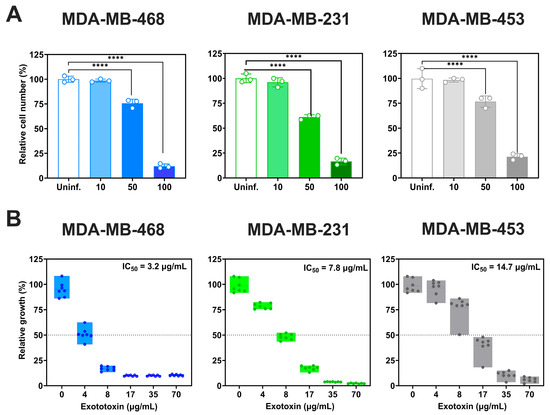 We also examined the effects of P. aeruginosa exotoxins (Figure 3B). Exotoxin exposure reduced cell viability in a dose-dependent manner, with IC50 values of 3.2 µg/mL (95% CI: 3–3.6 µg/mL) for MDA-MB-468, 7.8 µg/mL (95% CI: 7.6–8.0 µg/mL) for MDA-MB-231, and 14.7 (95% CI: 14.09–15.33 µg/mL) for MDA-MB-453, relative to untreated controls.