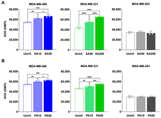 TNBC cells were then infected with S. aureus or P. aeruginosa at different MOIs and subsequently treated with 100 nM doxorubicin for 24 h (Figure 4 and Figure S4). In uninfected controls doxorubicin accumulation (quantified by flow cytometry based on the intrinsic fluorescence of doxorubicin) differed by cell line, with MDA-MB-468 > MDA-MB-231 > MDA-MB-453 (54,427 ± 393; 43,694 ± 1876; 34,652 ± 1512, respectively).