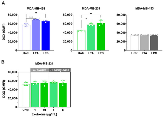 Effect of bacterial ligands and exotoxins on doxorubicin accumulation in TNBC cell lines. (A) MDA-MB-468, MDA-MB-231, and MDA-MB-453 cells were treated with 10 µg/mL P. aeruginosa lipopolysaccharide (LPS) or S. aureus lipoteichoic acid (LTA), together with 100 nM doxorubicin (DOX), for 24 h. (B) Total exotoxins S. aureus (SA Exo) and from P. aeruginosa (PA Exo) were prepared, and their IC50 values determined (10 µg/mL for SA Exo; 8 µg/mL for PA Exo). MDA-MB-231 cells were then treated with exotoxins at IC50 or at a lower concentration (1 µg/mL), together with 100 nM DOX, for 24 h. Intracellular DOX accumulation (GMFI) was quantified in viable cells by spectral flow cytometry. DOX-treated cells (no ligand or exotoxin) served as controls. Untreated (Untr.) Data are mean ± SD from three independent experiments. Statistical significance was assessed by one-way ANOVA with Tukey’s multiple comparisons test (* p < 0.05, ** p < 0.01; *** p < 0.001).