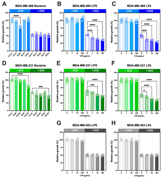 We next examined the effects of bacterial ligands, either alone or in combination with IC50 concentrations of doxorubicin. In all three TNBC lines, LPS (Figure 6B,E,G) and LTA (Figure 6C,F,H) alone did not alter growth at the concentrations tested (1–100 µg/mL). However, when combined with doxorubicin at IC50 concentrations, both ligands significantly enhanced doxorubicin-induced growth inhibition in MDA-MB-468 and MDA-MB-231 cells in a concentration-dependent manner. In MDA-MB-468 cells, growth declined to ~40% with LPS and ~30% with LTA at the highest concentrations tested (Figure 6B,C). Comparable effects were observed in MDA-MB-231 cells, where growth decreased to ~45% and ~34%, respectively (Figure 6E,F). By contrast, MDA-MB-453 cells showed no change in response to LPS or LTA either alone or in combination with doxorubicin at its IC50 concentration (51 nM [2]).
