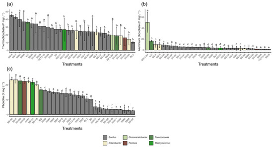 Solubilization of different mineral sources by different bacterial isolates after 7 days of incubation. (a) Phosphorus solubilization from thermophosphate. (b) Phosphorus solubilization from aluminum phosphate (AlPO4). (c) Potassium solubilization from phonolite. All values are expressed in mg L−1. Means followed by the same letter do not differ statistically from each other according to the Scott-Knott test at 5% probability.
