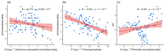 Correlation between pH values and solubilization of mineral sources by bacterial isolates after 7 days of incubation. (a) Correlation between culture medium pH and the solubilization of aluminum phosphate, (b) thermophosphate, and (c) potassium. The blue points represent the observations. The red line indicates the linear trend, and the pink band represents the 95% confidence interval for that trend. R is the Pearson correlation coefficient, and p is the p-value for the two-tailed test. p-value less than 0.05 indicate statistically significant correlations.