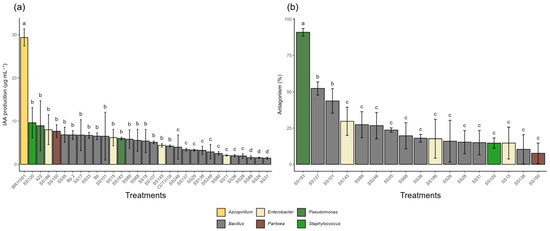 Indoleacetic acid (IAA) production and antagonistic activity by bacterial isolates. (a) IAA production (µg·mL−1) by bacterial isolates grown in tryptophan-supplemented medium. (b) Antagonistic activity (% inhibition) against Fusarium spp. Isolates that did not show antagonistic activity (% inhibition = 0%) are not represented in the graph. Different letters above the bars indicate statistical differences by the Scott-Knott test at 5% probability.