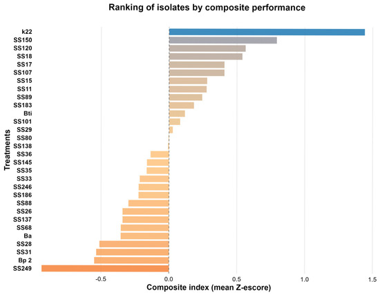 Ranking of bacterial isolates based on the composite performance index. The composite index was calculated by standardizing (Z-score method) the mean values of all analyzed variables (P solubilization from aluminum phosphate, P solubilization from thermophosphate, potassium solubilization from phonolite, indoleacetic acid production, and antagonist activity). The final index corresponds to the mean Z-score of each isolate, allowing the ordering of treatments according to their multifunctional performance. Isolates are organized from highest (top) to lowest (bottom) composite performance. The colors represent the relative values of the composite performance index. A divergent color scale was applied (orange–beige–blue), where warmer colors (orange) indicate isolates with lower index values, beige indicates values close to the median, and blue indicates isolates with higher index values.