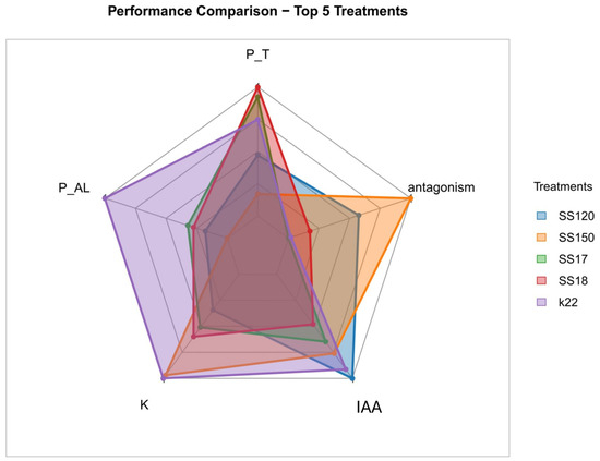 The five isolates that presented the best results in the evaluated growth-promoting attributes were compared using a radar chart highlighting their specific functional characteristics (Figure 5). The P. azotoformans K22 isolate presented the highest composite index, emphasizing IAA production and phosphorus solubilization in both sources analyzed. The E. hormaechei SS150 and S. sciuri SS120 isolates showed balanced performance across all metrics, with consistent values across all variables analyzed. The isolate B. cereus SS18 excelled in K availability, whereas B. cereus SS17 had an intermediate profile. The shape of the polygons in the radar plot indicated that these isolates had significant peaks, but with a notable contribution to antagonism. The polygon configuration in the graph highlights that these isolates have complementary functional potential, reinforcing their viability for use in bacterial consortium formulations capable of integrating multiple mechanisms for plant growth promotion and biocontrol.