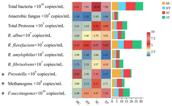 Rumen contents: On the morning of day 30, approximately 100 mL of rumen fluid was collected before feeding and 3 h post-feeding using an oral-nasal probe equipped with a metal filter and a manual pump (Chengdu Huazhi Kaiwu Technology Co., Ltd., Chengdu, China). Immediately after collection, the pH of each sample was measured using a pH meter (LE438, Mettler-Toledo Instrument Co., Ltd., Shanghai, China). The samples were subsequently stored at −20 °C for further analysis of volatile fatty acids (VFAs), ammonia N (NH3-N), microbial crude protein (MCP), enzyme activity and microbial diversity. The concentration of NH3-N in the rumen fluid was determined by the phenol-sodium hypochlorite colorimetric method [32]. The VFA content was measured using gas chromatograph (GC122, Shanghai Precision Scientific Instrument Co., Ltd., Shanghai, China) [33]. Enzymatic activity (Carboxymethyl-cellulase, Pectinase, Cellobiase, Xylanase) was then measured via spectrophotometric colorimetry (UV3000, Shanghai Meipuda Instrument Co., Ltd., Shanghai, China) [34]. Protease activity in rumen fluid was determined by the Folin-phenol method. The MCP content in rumen fluid was measured using the Coomassie brilliant blue colorimetric method [35]. DNA was extracted from rumen microorganisms using the CTAB method. Subsequently, primers synthesized by Beijing Genomics Institute Co., Ltd., (Beijing, China) were used according to the instructions provided with the TaKaRa kit (Beijing Baorui Biological Technology Co., Ltd., Beijing, China). Real-time PCR quantification was carried out using an ABI StepOnePlus instrument (Applied Biosystems, Waltham, MA, USA), achieving amplification efficiencies between 90% and 110% and a standard curve with an R2 ≥ 0.999 [36].