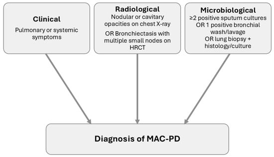 Schematic representation of the American Thoracic Society diagnostic criteria for Mycobacterium avium complex pulmonary disease (MAC-PD). Diagnosis requires all three criteria: (i) clinical symptoms, (ii) compatible radiological findings on chest X-ray or high-resolution computed tomography (HRCT), and (iii) microbiological confirmation through positive cultures or biopsy.