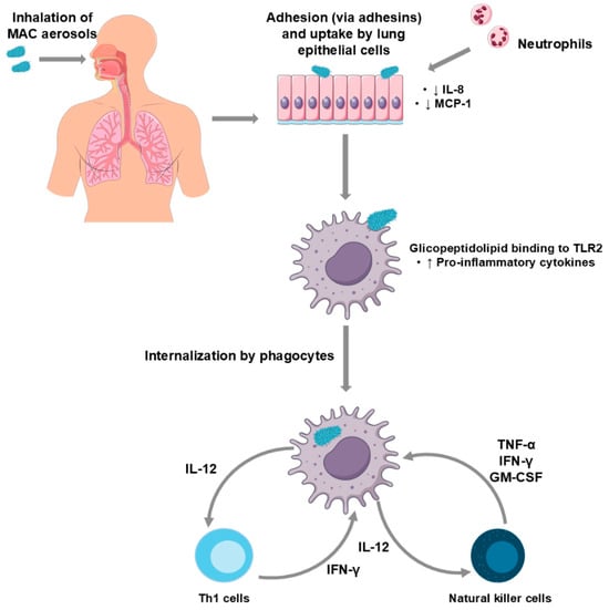 Neutrophils are part of the innate immune response, acting in the initial phase of MAC infection. Although neutrophil involvement is not very frequent, some of these immune cells are capable of phagocytosis and killing the mycobacteria [115]. Infected neutrophils can also produce tumour necrosis factor-α (TNF-α) and interleukin-12 (IL-12), stimulating nearby macrophages [116], the primary immune cells responsible for clearing the mycobacterial infection.