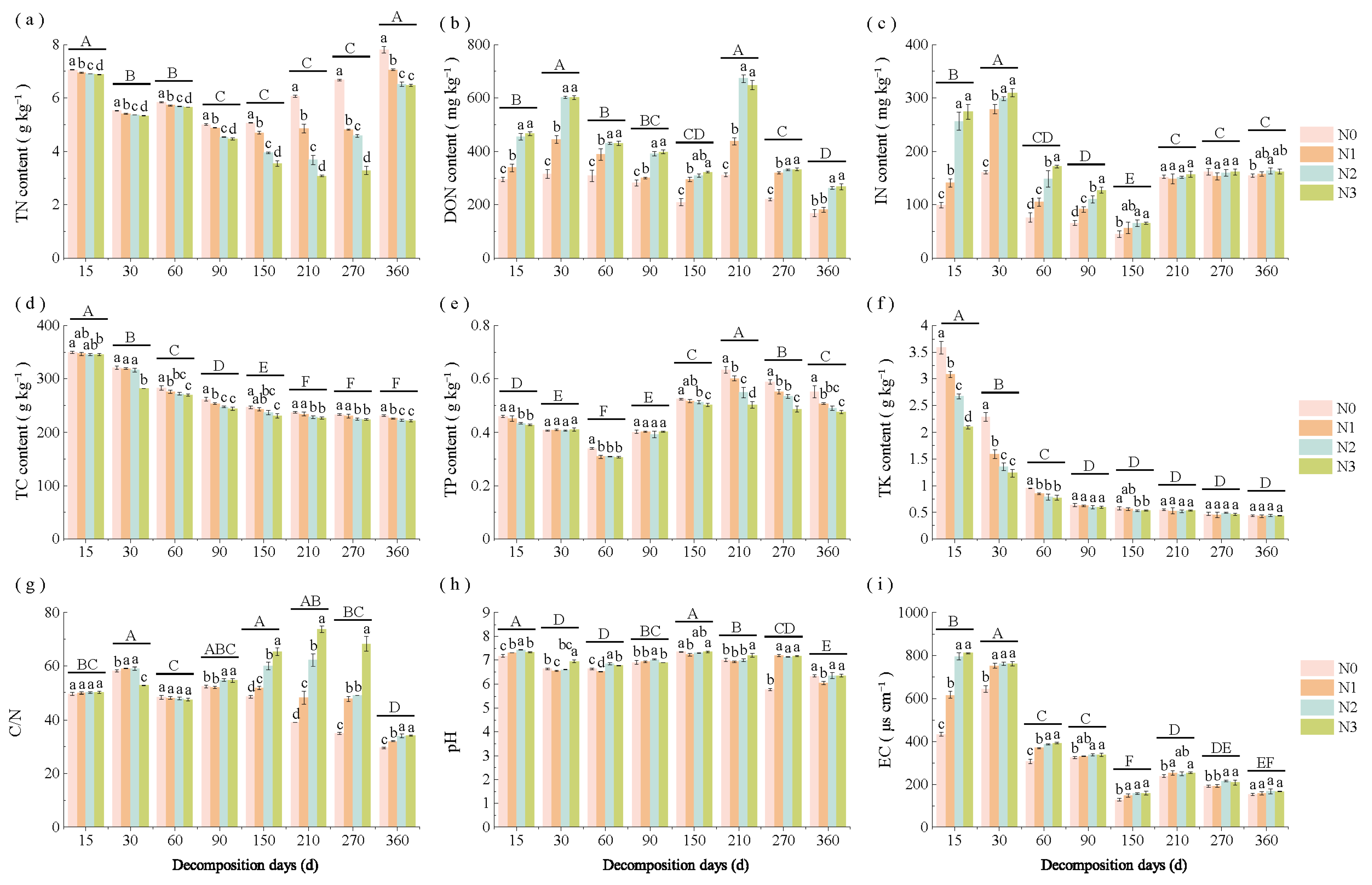 3.1. Changes in Straw Properties Under Different Decomposition Stages and N Application Rates