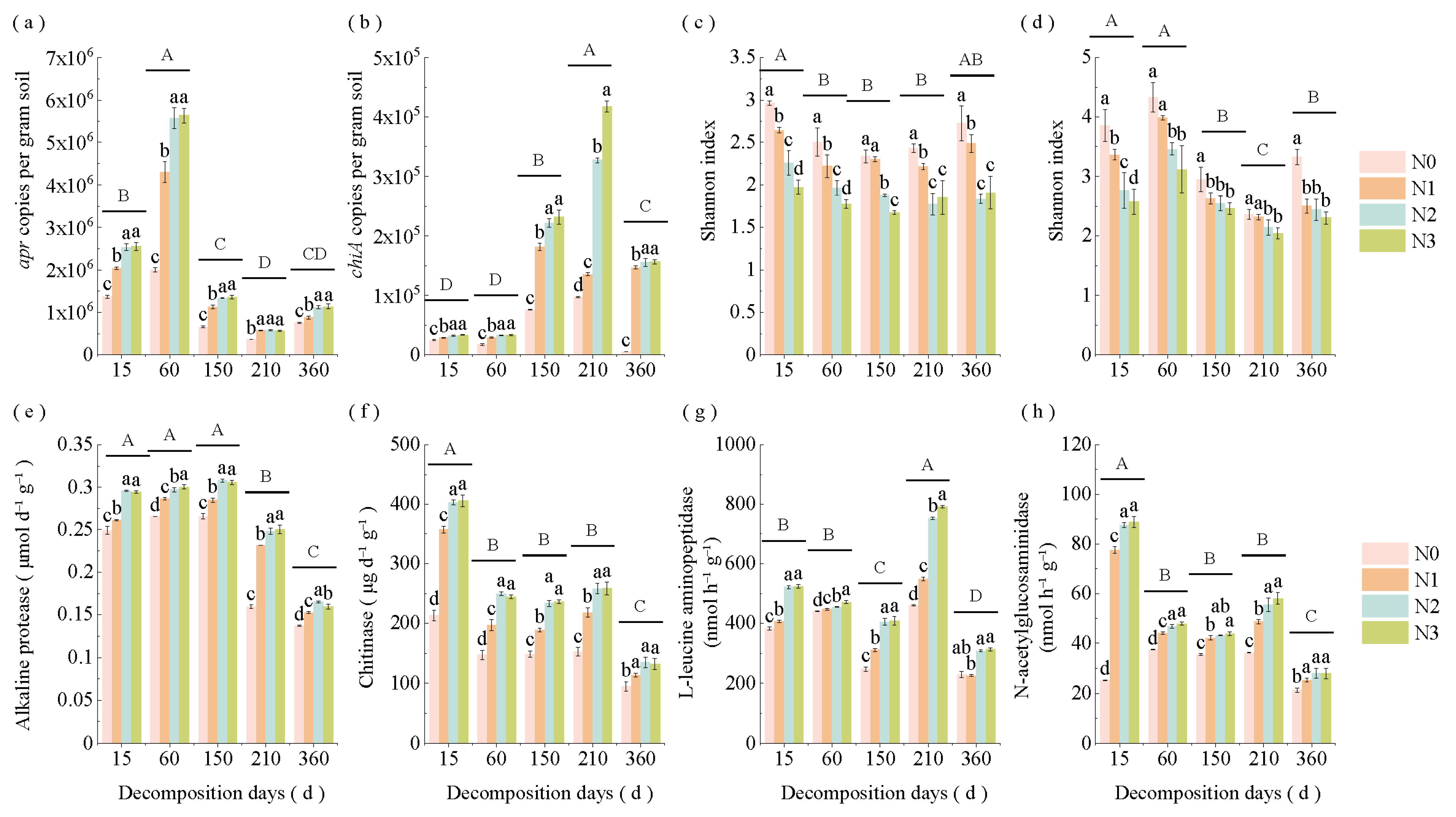3.2. Changes in Straw apr and chiA Gene Levels, α-Diversity, and Enzyme Activities Under Varying Decomposition Stages and N Application Rates
