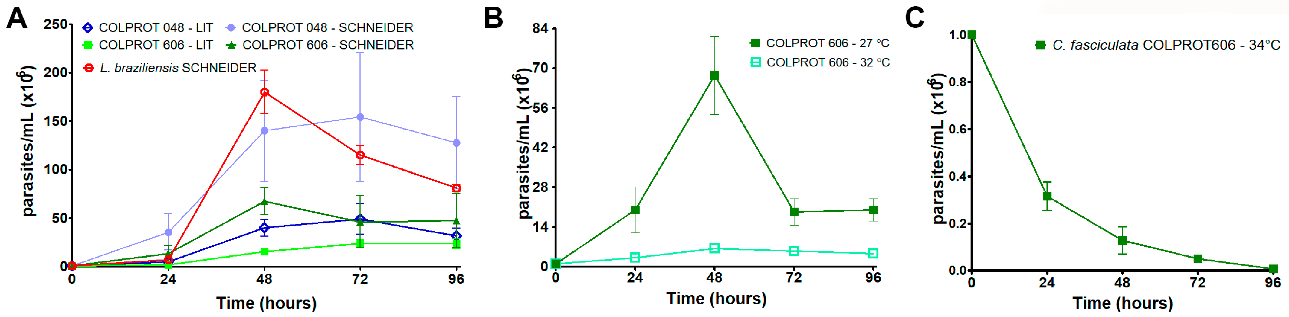 3.2. Cell Growth Evaluation in Leishmania-Crithidia Co-Cultures