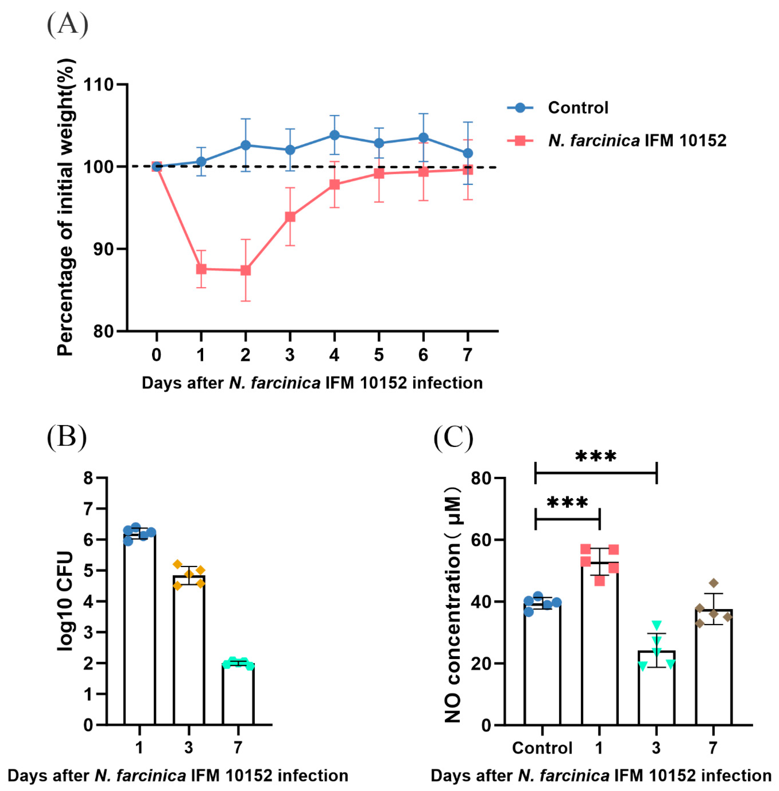 APA StyleYao, J., Han, L., Shen, J., Du, B., Song, Z., Yuan, M., Xu, S., Qiu, X., Liu, X., Li, F., Liang, Y., Guan, W., & Li, Z. (2025). Nitric Oxide Contributes to the Pathogenesis of Nocardia farcinica Infection in BALB/c Mice and Alveolar MH-S Macrophages. Microorganisms, 13(10), 2336. https://doi.org/10.3390/microorganisms13102336
