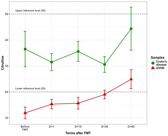 - Rashidi, A.; Shanley, R.; Holtan, S.G.; MacMillan, M.L.; Blazar, B.R.; Khoruts, A.; Weisdorf, D.J. Pretransplant Serum Citrulline Predicts Acute Graft-versus-Host Disease. Biol. Blood Marrow Transplant. 2018, 24, 2190–2196. [Google Scholar] [CrossRef]