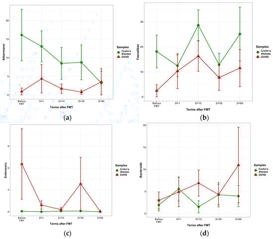 | Microbial Genera | GVHD (n = 12) | Crohn’s Disease (CD), n = 15 | Control Group (n = 148) | GVHD vs. CD, p Values | GVHD vs. Control Group, p Values | CD vs. Control Group, p Values |
