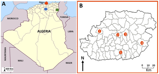 Figure 1. (A) Geographical distribution of the three sampling regions: () Tizi Ouzou, () Msila () Tébessa (B). Location of the five sampling stations within Tizi-Ouzou Province ((1) Draâ Ben Khedda, (2) Tizi Rached, (3) Mekla, (4) Bouzgeune, (5) Ouacif).