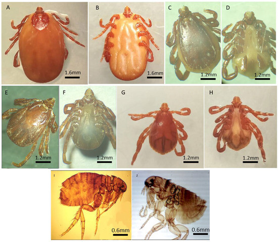 Figure 2. Morphological identification of adult’s ticks and fleas. R. turanicus ♀ ((A) dorsal view, (B) ventral view); R. turanicus ♂ ((C) dorsal view, (D) ventral view); R. sanguineus s.l ♀ ((E) dorsal view, (F) ventral view); R. sanguineus s.l ♂ ((G) dorsal view, (H) ventral view); C. felis ♀ (I) and C. felis ♂ (J) Light stereomicroscope View (Magnification ×20).