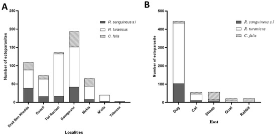 Figure 3. Distribution of ectoparasites across various capture locations (A) and among different host species (B).