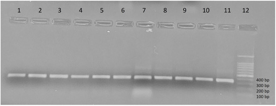 Figure 4. Amplification profile of the Leishmania ITS1 gene visualized on a 1% agarose gel. Lanes 1–4: samples of R. sanguineus s.l, lanes 5–8: samples of R. turanicus, lanes 9–10: samples of C. felis, lane 11: positive control (reference strain LEM75/L. infantum MON-1), lane 12: DNA Ladder.
